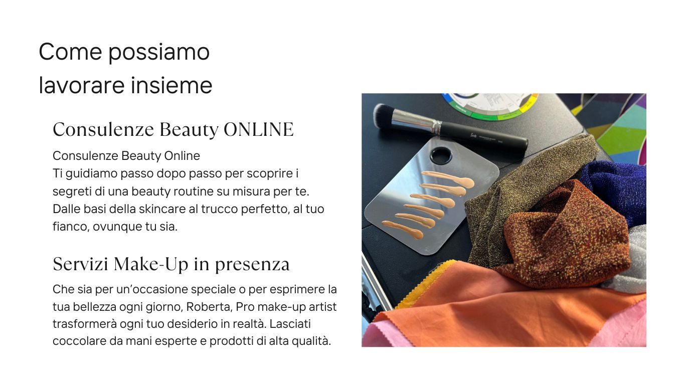 Scegli tra i servizi make-up in presenza e le consulenze beauty online per scoprire come poter personalizzarle in base alle tue esigenze.